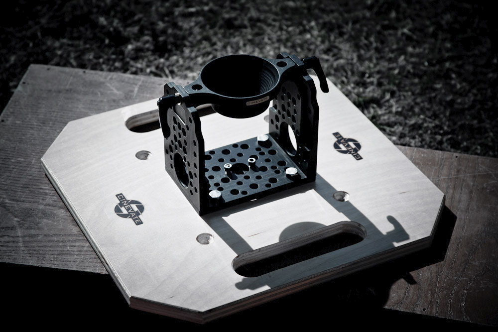 Setup can be as simple as placing Dromos on the ground using the Dromos Hi Hat Board. You can also achieve that ultra low shot by attaching it to a tripod, jib, dolly or slider via the cheese plate - which provides both 3/8" and 1/4" holes.