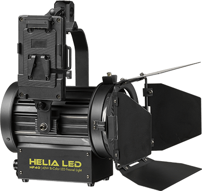 The flicker feature can be tuned to any frequency. HF40 lights can be powered with a pro battery and come with V-mount battery plates and DC cables. They also come with barn doors and AC power cables. A heavy-duty case and sturdy stands allow for quick setups wherever you choose to shoot.