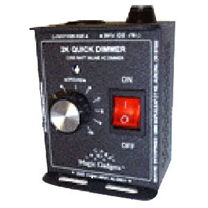 Compact, reliable, and quiet, these units are head and shoulders above dimmers of comparable price. A great little dimmer designed especially for use in situations where you need a few dimmers in a lighting grid or display without using a dimmer rack, bulky rheostat, or other clumsy solution. There is no minimum load necessary for proper operation. The unit has rails to help protect controls and for hanging from light stands, lighting grid, etc., graduated output level control, ground integrity indicator, u-ground ac connectors, lighted (output indicating) on/off switch and BLF 20 amp fuse. Triple Quick has 3 of everything with single ground indicator. 8/3 wire lead option (instead of u-ground connectors) available extending peak load limit. Size appx. 2x3.5x4". Bates, or other connectors added at additional cost.