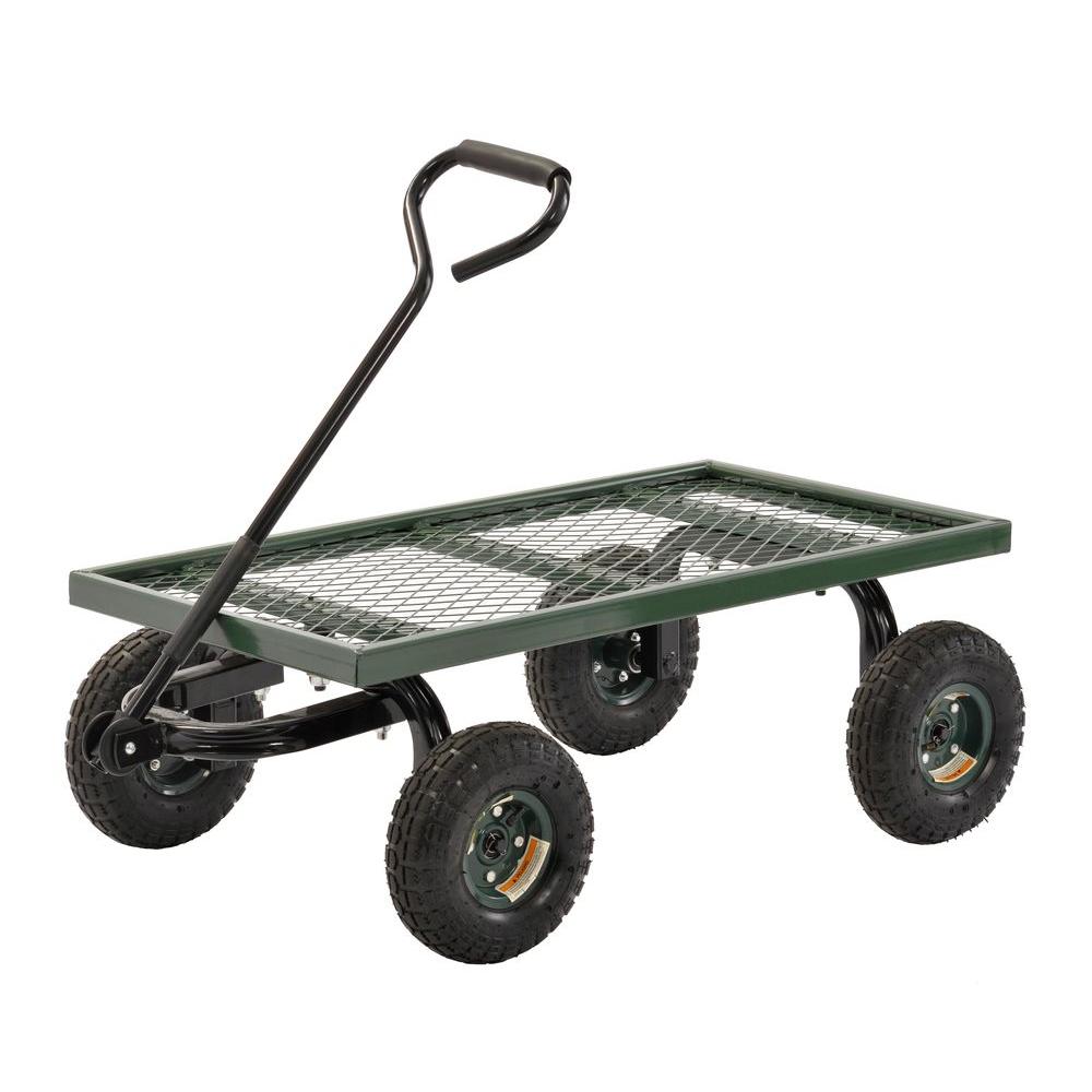 Heavy duty steel mesh deck with 2 in. high side edges to keep items from rolling off. Heavy-duty 4 x 10 in. pneumatic tires for easy rolling over any surface. Auto-type steering keeps front wheels under corners of steel frame to prevent tipping. Large D-handle for easy grip.